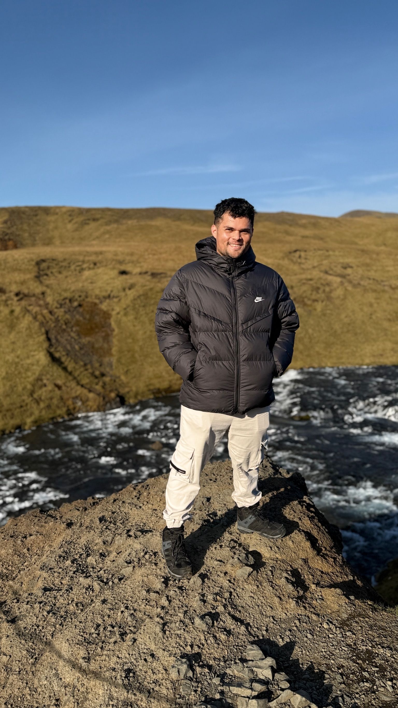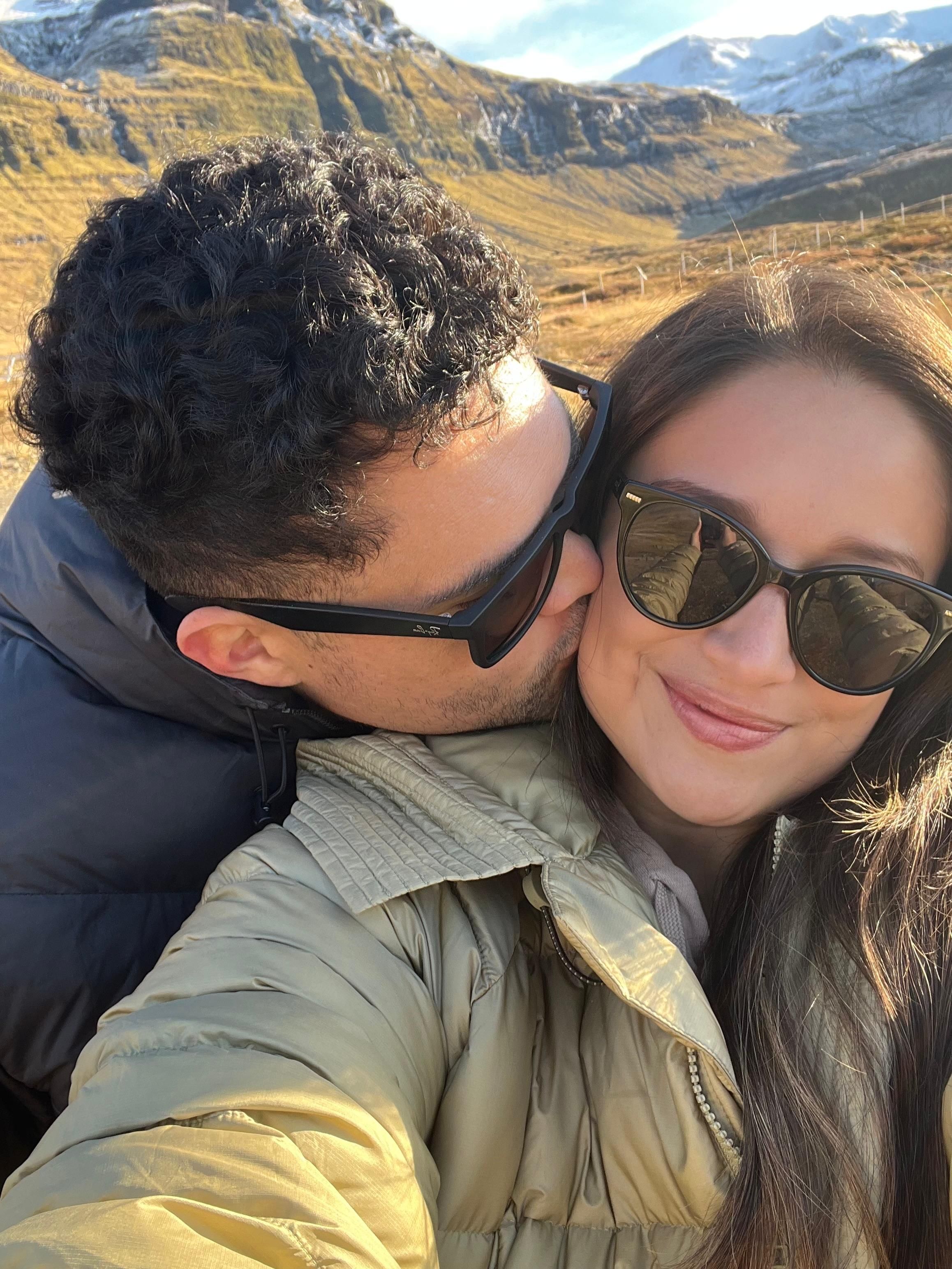 En una de las actividades que hicimos, fuimos a conocer un rio termal que se llama Reykjadalur en horas de la tarde y que estaba en ese momento rodeado de nieve, por lo que el paisaje se veía como un sueño, un celaje muy bonito en medio de esas montañas blancas. Durante la caminata en el momento que no se veía nadie al rededor, le pregunte que tomaramos una foto y fue ahí justo el momento donde le hice la pregunta ...................... y me dijo que si.